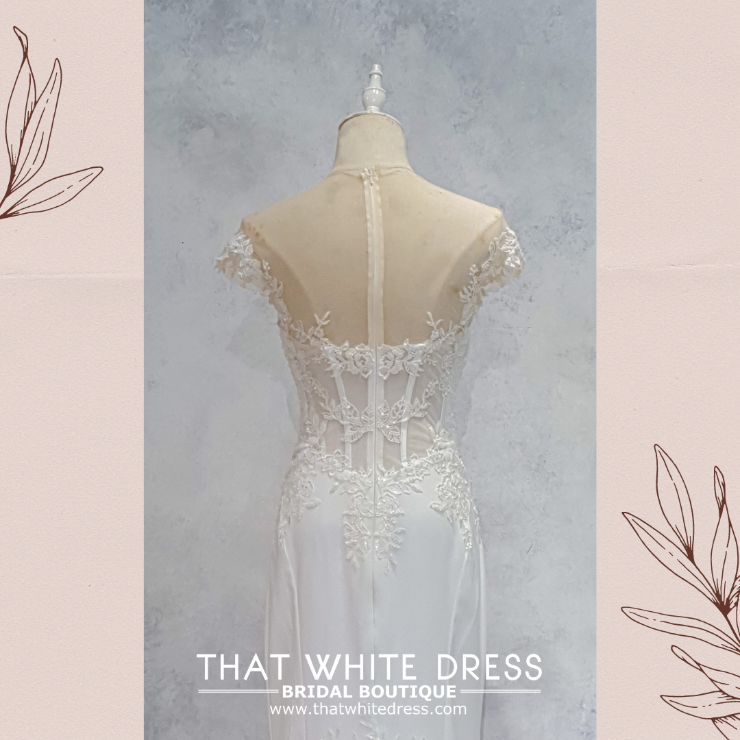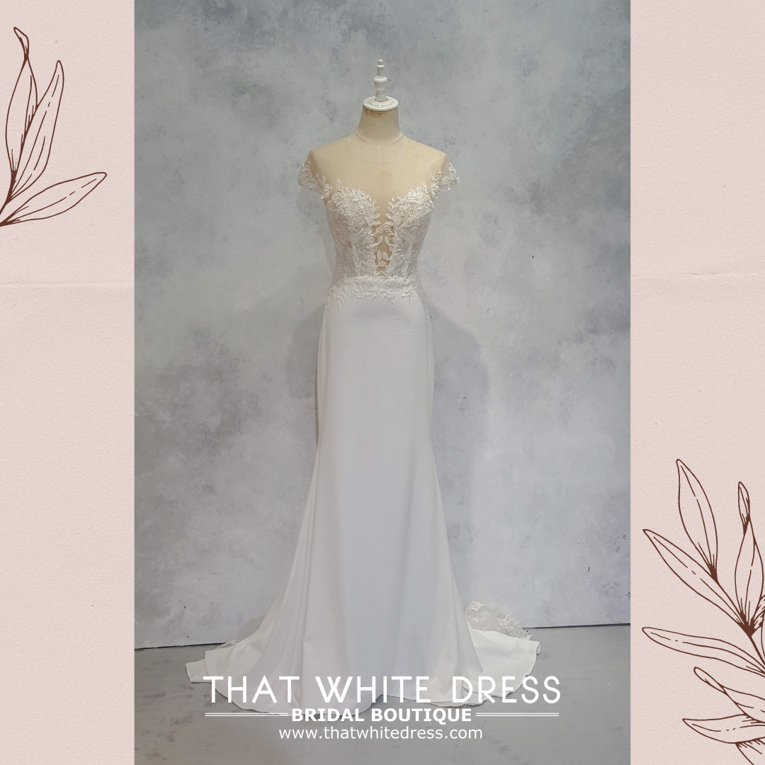 Elegant wedding dress in gorgeous floral lace in illusioned neckline and straight cut crepe skirt.