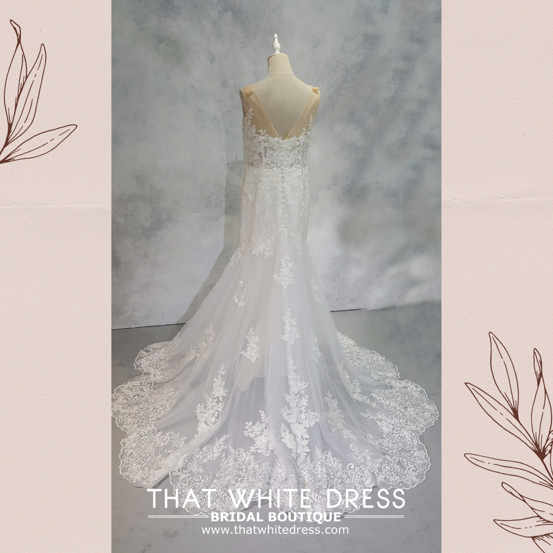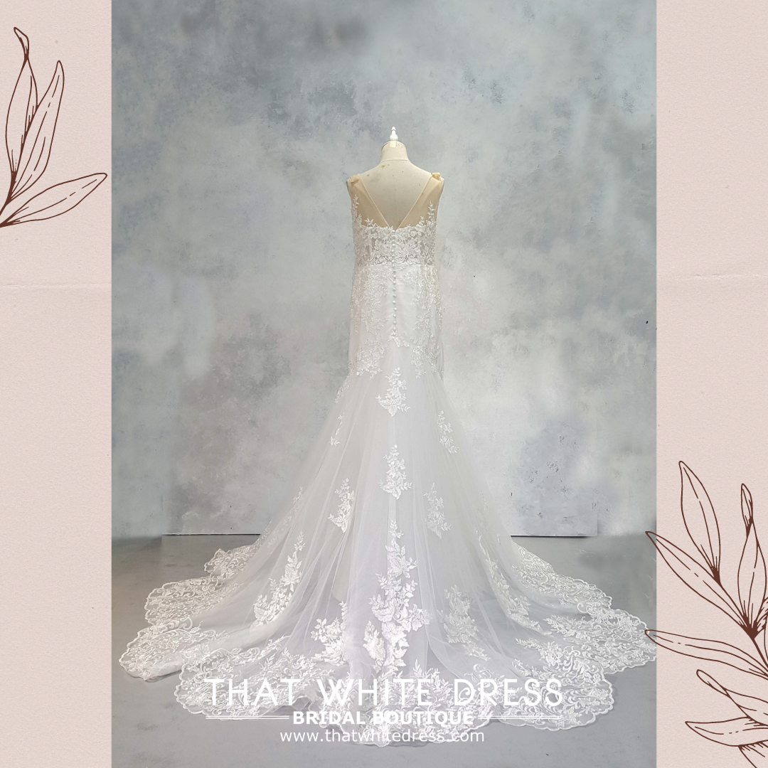 Elegant wedding dress in gorgeous floral lace in illusioned neckline and trumpet cut skirt for our curvy bride.