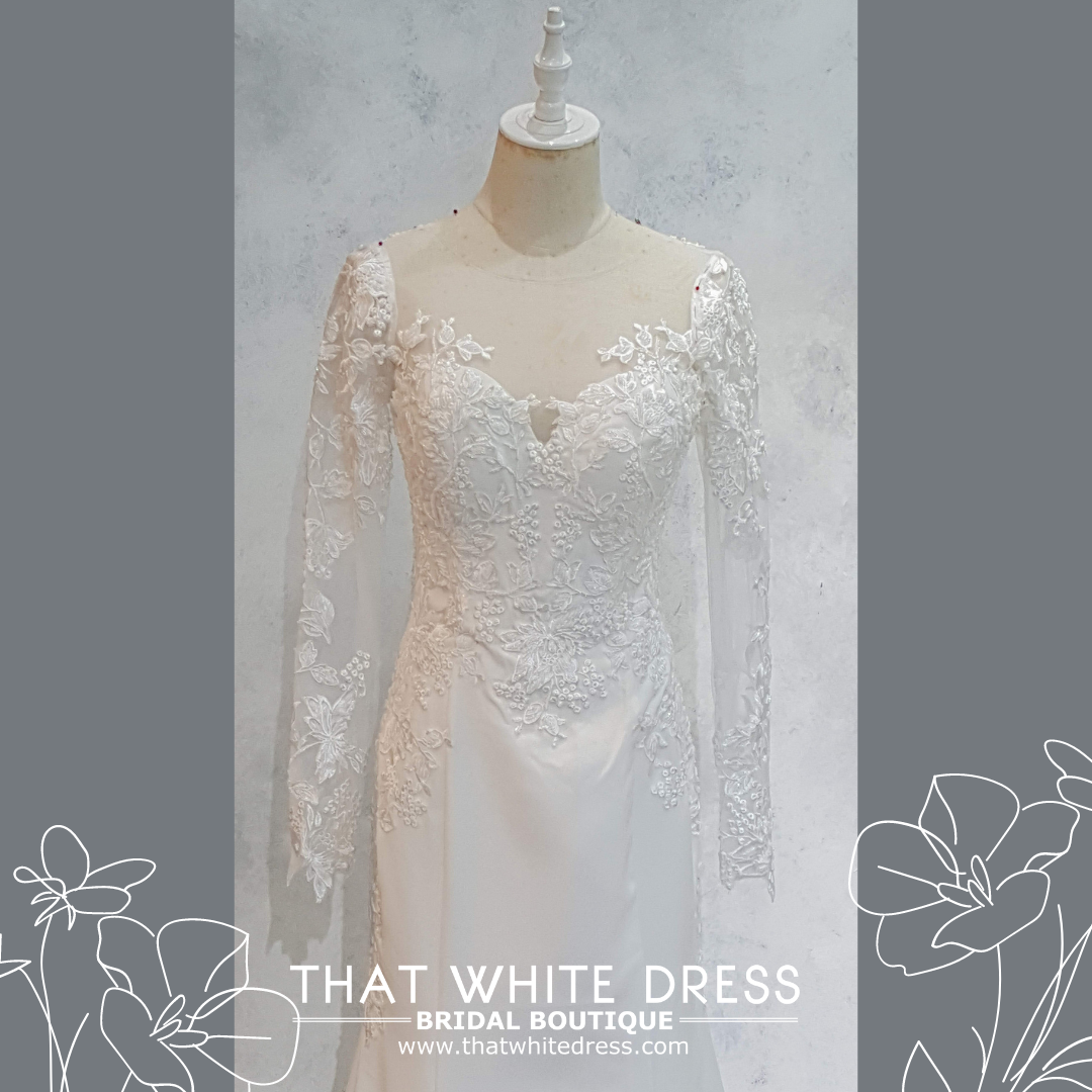 224EL04W01 Gigi2 LS Crepe illusion neck floral lace Wafa White Net Long Sleeves Wedding Dress Rental Malaysia, Pengantin Muslimah Malaysia, Muslim Bride Malaysia, Church wedding dress long Sleeves Malaysia