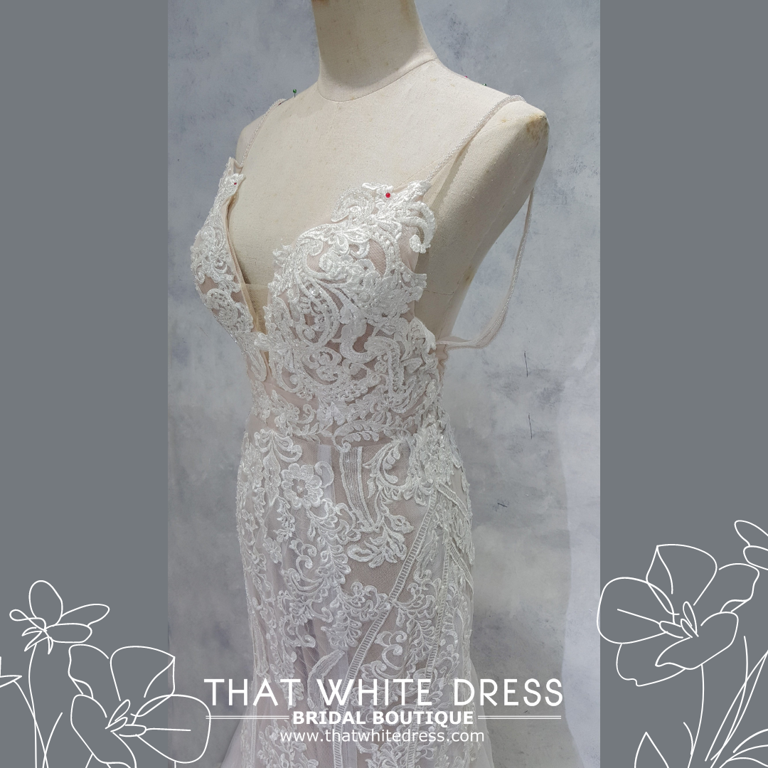 910BY05W02 Barrie Strap V illusion neck A line lace Low Back Button