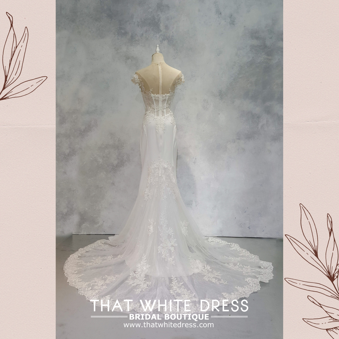 Elegant wedding dress in gorgeous floral lace in illusioned neckline and straight cut crepe skirt.