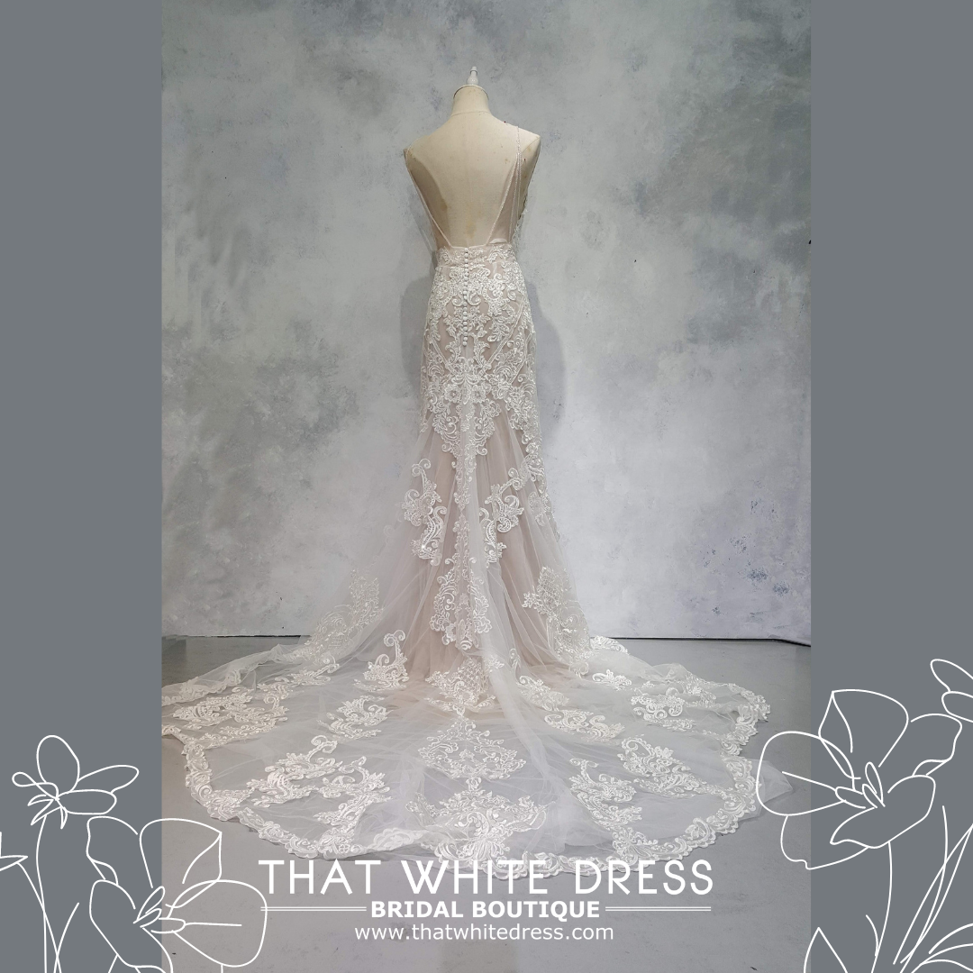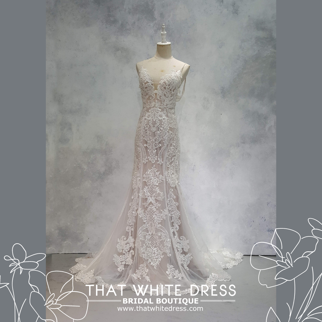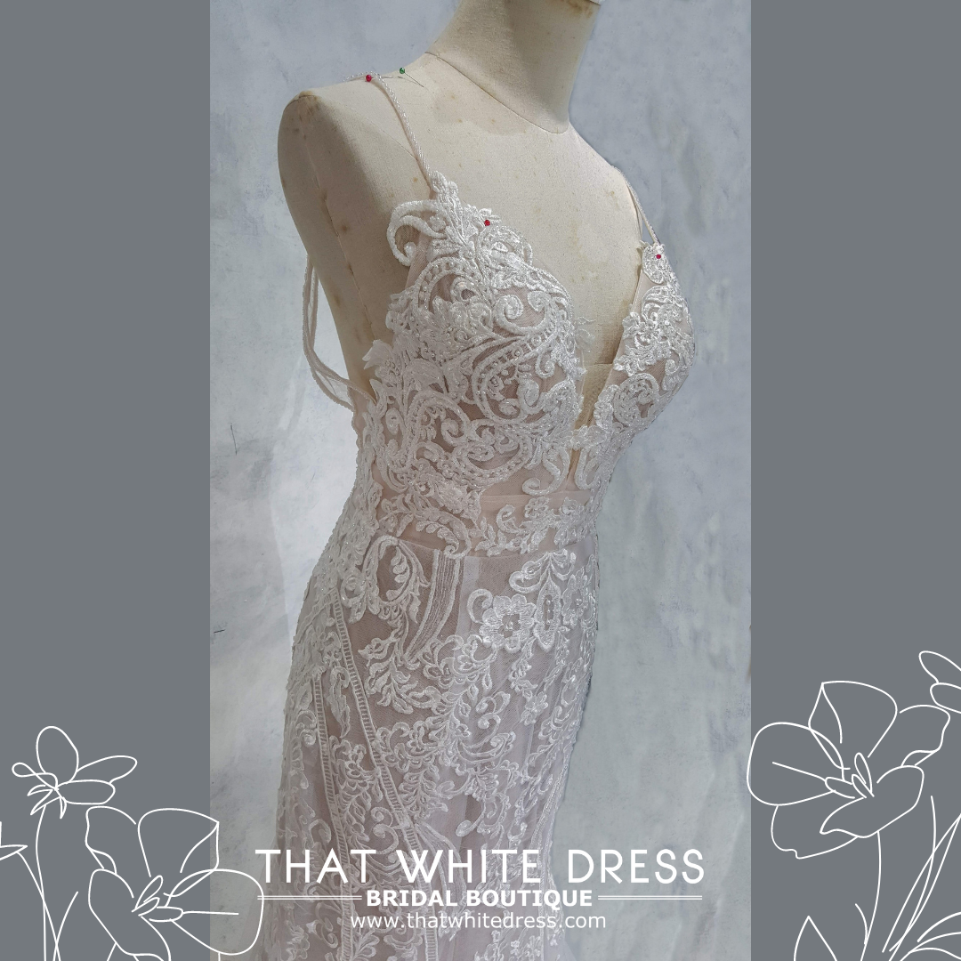 Elegant wedding dress in gorgeous floral lace in spaghettie strap and trumpet style.