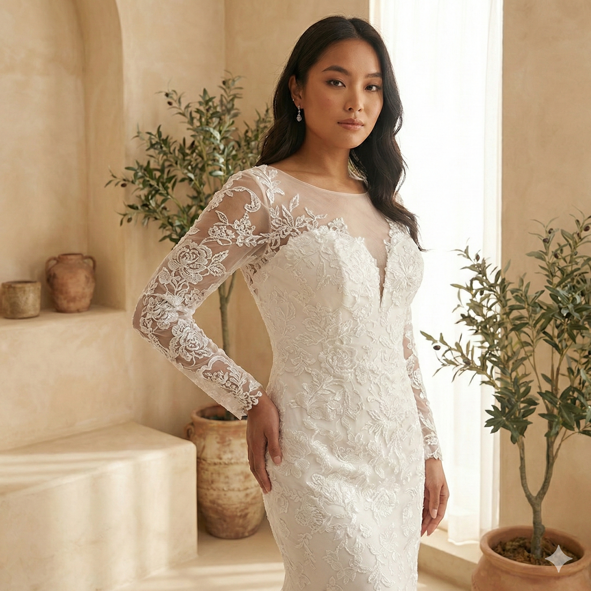 Elegant wedding dress in gorgeous floral lace in illusion neckline with beautiful baroque French chantily lace. Available in long sleeves or sleeveless.